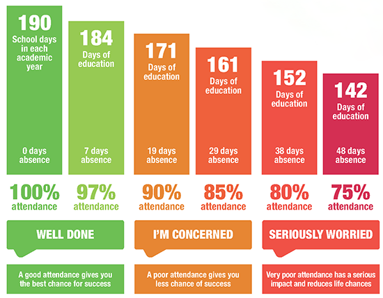 Persistent absence is when a child's attendance at school falls below 90%. We have a duty to ensure that children are attending school regularly and to support families with improving attendance. We do this through weekly tracking of all children's attendance. When attendance starts to become a concern we will notify you by text, letter or in some cases invite you in for a meeting to discuss. Whilst we understand that there are genuine reasons why a child might not be in school, it is important that we work together to ensure that children are not missing learning time.